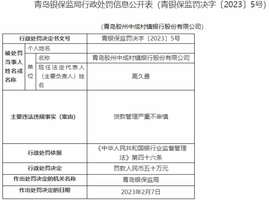 中国经济网北京2月10日讯 银保监会网站今日公布的青岛银保监局行政处罚信息公开表(青银保监罚决字〔2023〕4号、5号)显示,青岛胶州中成村镇银行股份有限公司贷款管理严重不审慎。青岛银保监局依据《中华人民共和国银行业监督管理法》第四十六条,对其罚款人民币五十万元。