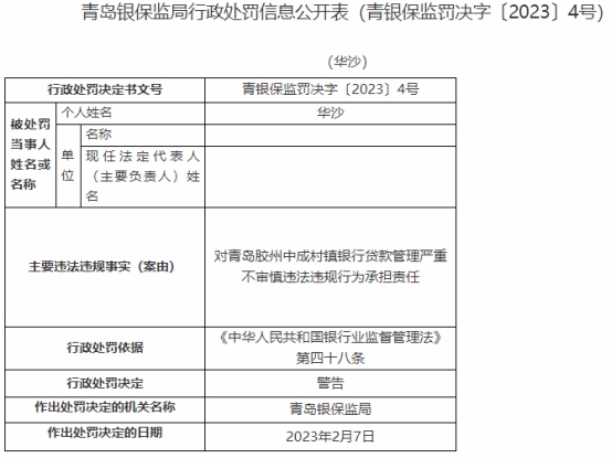 华沙对青岛胶州中成村镇银行贷款管理严重不审慎违法违规行为承担责任。青岛银保监局依据《中华人民共和国银行业监督管理法》第四十八条,对其警告。