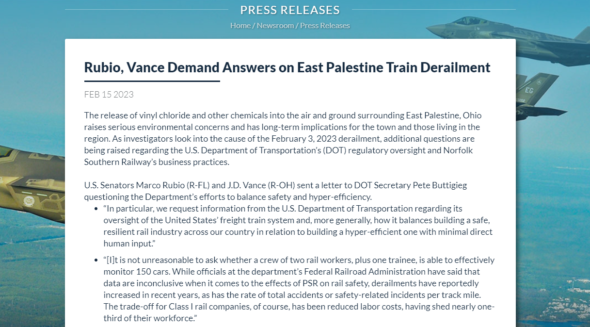 由两名参议员发出的联名信提到,Norfolk Southern这列列车只有三人在火车上,包括一名机车工程师,一名乘务员和一名实习生。