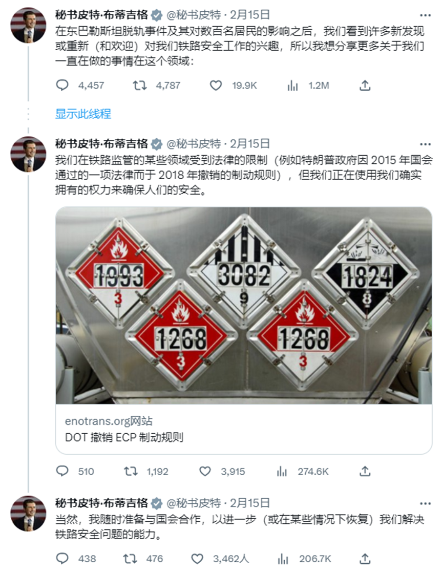 面对共和党参议员的质疑,Buttigieg周三在推特上进行了回应,称政府一直在努力,并将通过两党基础设施法案来进行投资,以升级铁路安全。