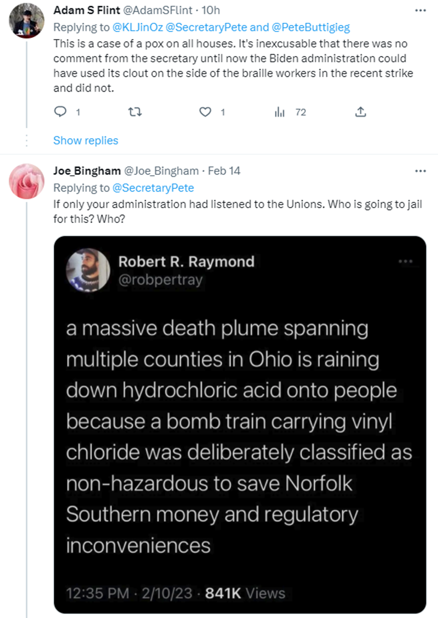 在Buttigieg推文的评论中,美国网友也表达了气愤之情,质疑Buttigieg为何等了10天才着手解决这一问题,还有人则表示Buttigieg为什么不亲自到俄亥俄州看一看。